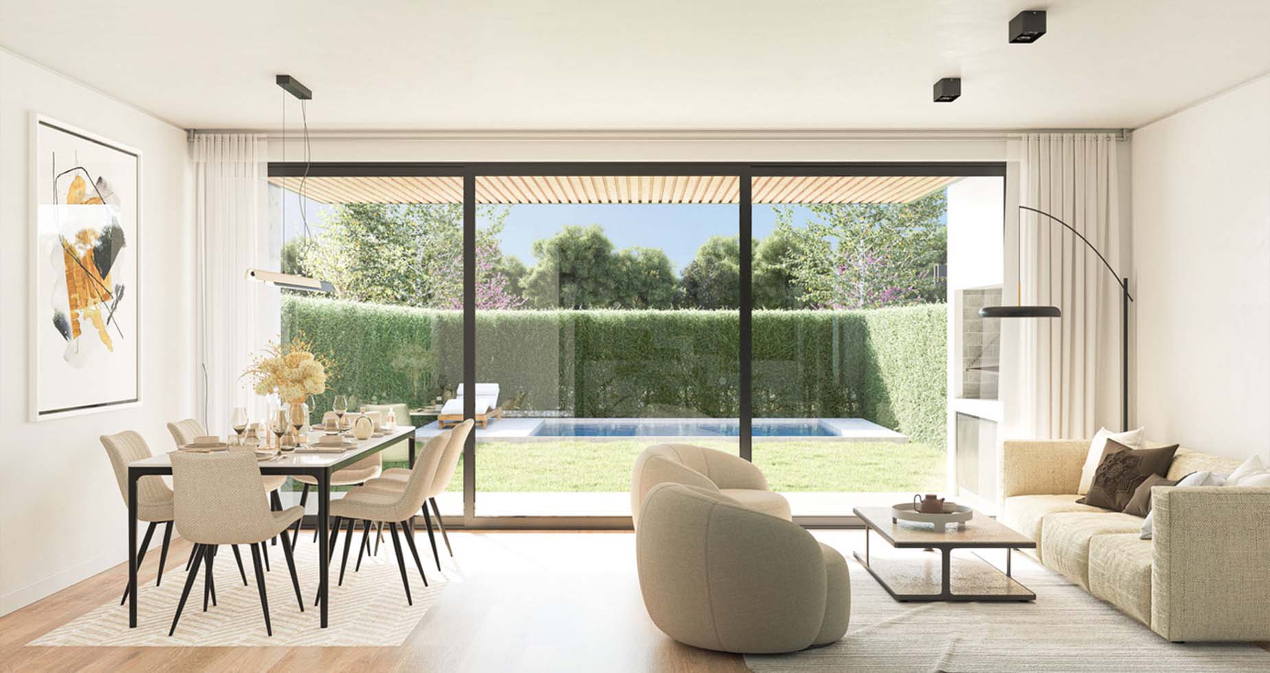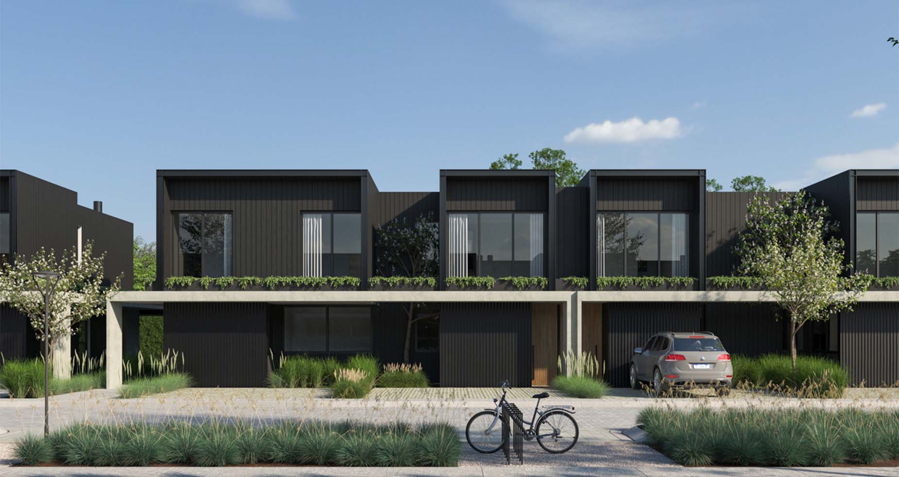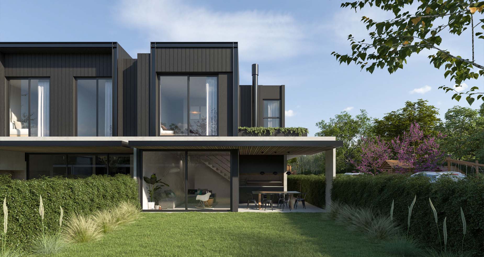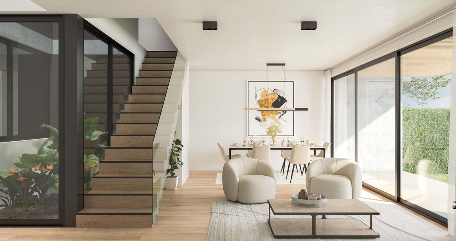 Estilo moderno, de ambientes amplios, luminosos y muy funcionales. Las casas cuentan con jardín interior y exterior propio, parrilla, espacio para dos autos y posibilidad de piscina.