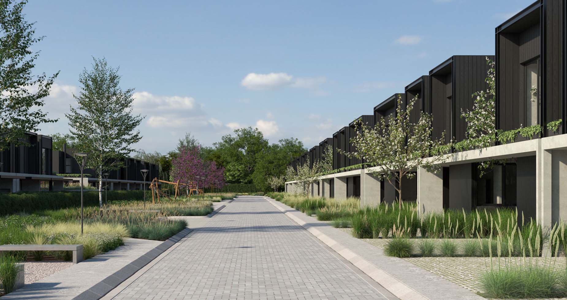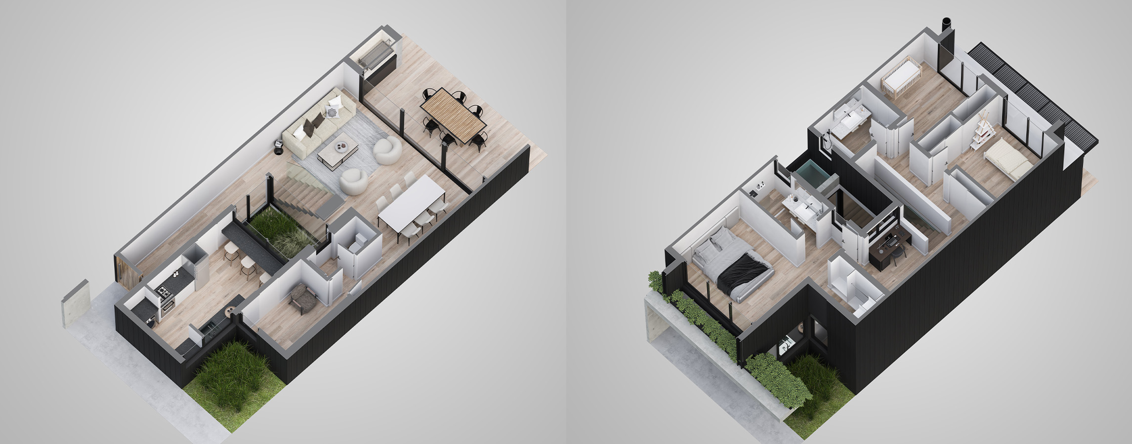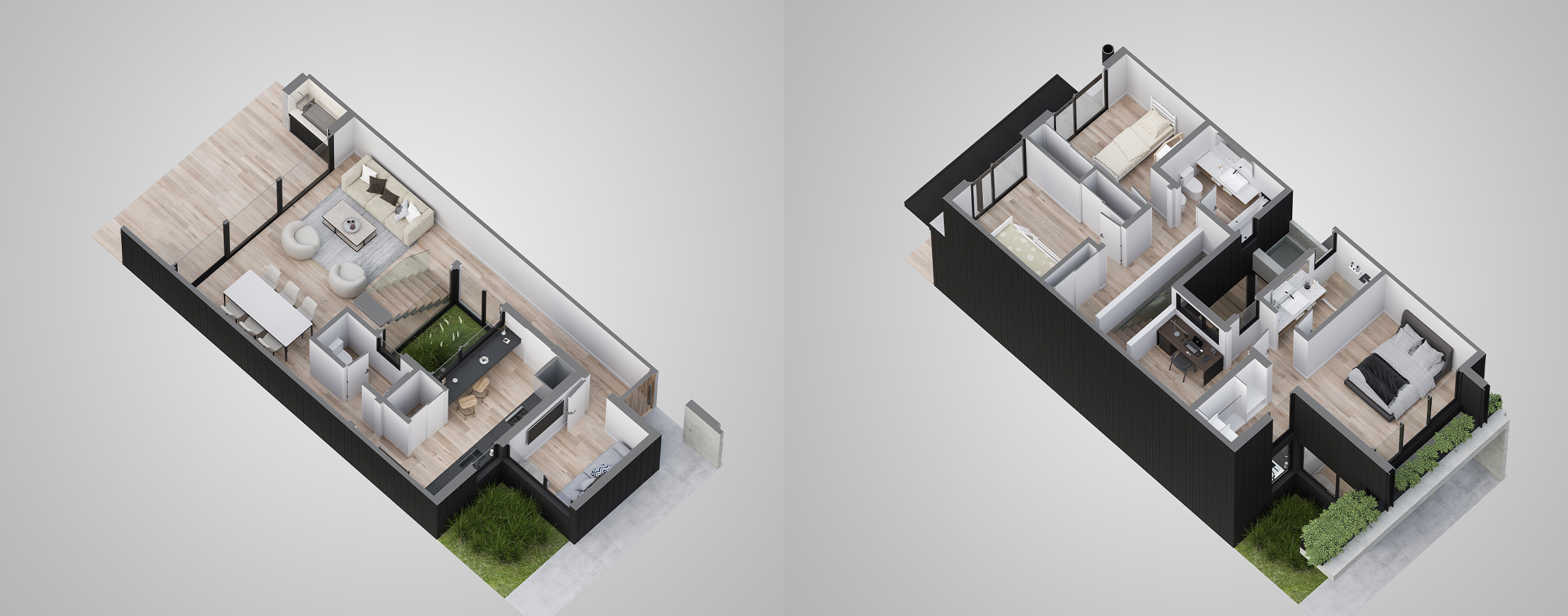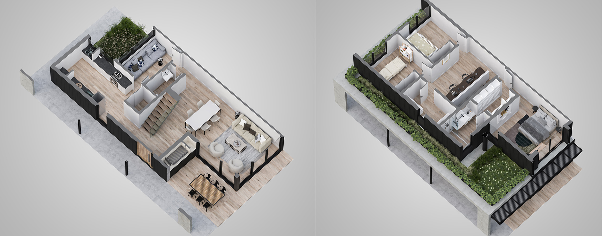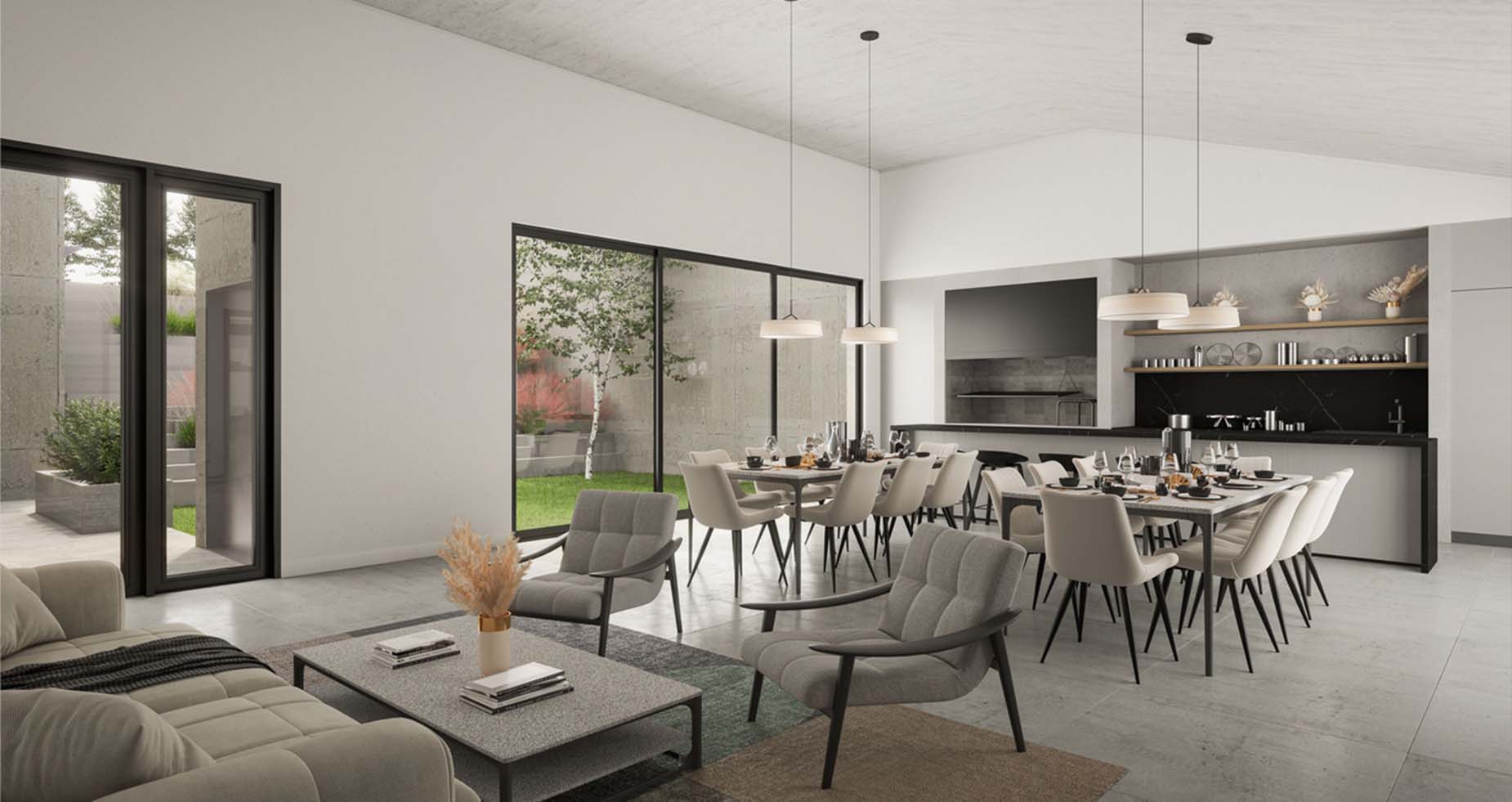 Estilo moderno, de ambientes amplios, luminosos y muy funcionales. Las casas cuentan con jardín interior y exterior propio, parrilla, espacio para dos autos y posibilidad de piscina.